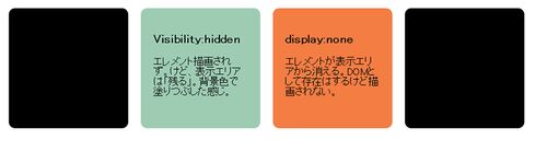 他のサイトからの転載。よくわかりました! visibility:hiddenは名前の通り、要素はあるけど見えない状態。display:noneは、要素も取得されず、完全にその場にない扱い。 検証準備 html <html lang="ja"> <head> <meta charset="UTF-8"> <title>difference between visibility hidden and display none</title> <link rel="stylesheet" href="css/style.css"> </head> <body> </body></html>